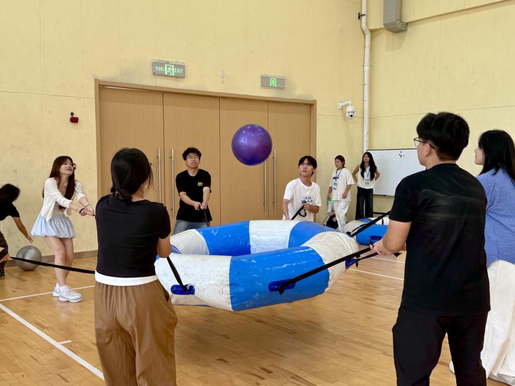 隨后的素質拓展項目環環相扣,將活動氣氛不斷推向高潮。熱身游戲“愛的抱抱”以輕松有趣的方式迅速點燃全場,同學們反應敏捷,默契配合,歡聲笑語中彼此的距離迅速拉近。在“重走長征路”項目中,隊員們需要高度專注、通力協作,通過精準控制地圖,引導網球沿著光輝的革命路線從“瑞金”穩步前行至“延安”。這個過程不僅是對團隊耐心與默契的嚴峻考驗,更讓同學們在“球落重來”的挫折與堅持中,深刻感悟了團結一心、不畏艱險的奮斗精神。